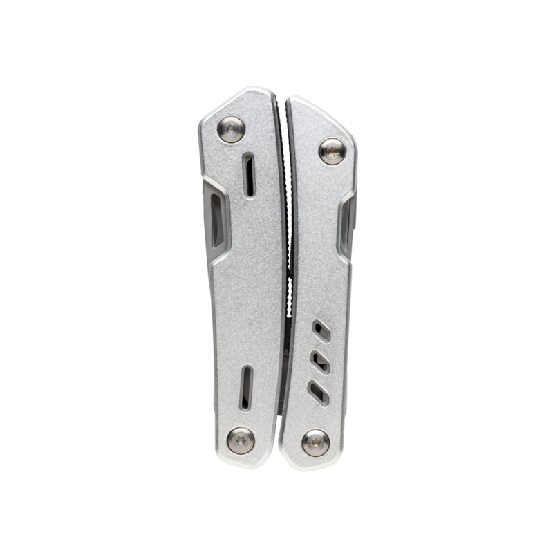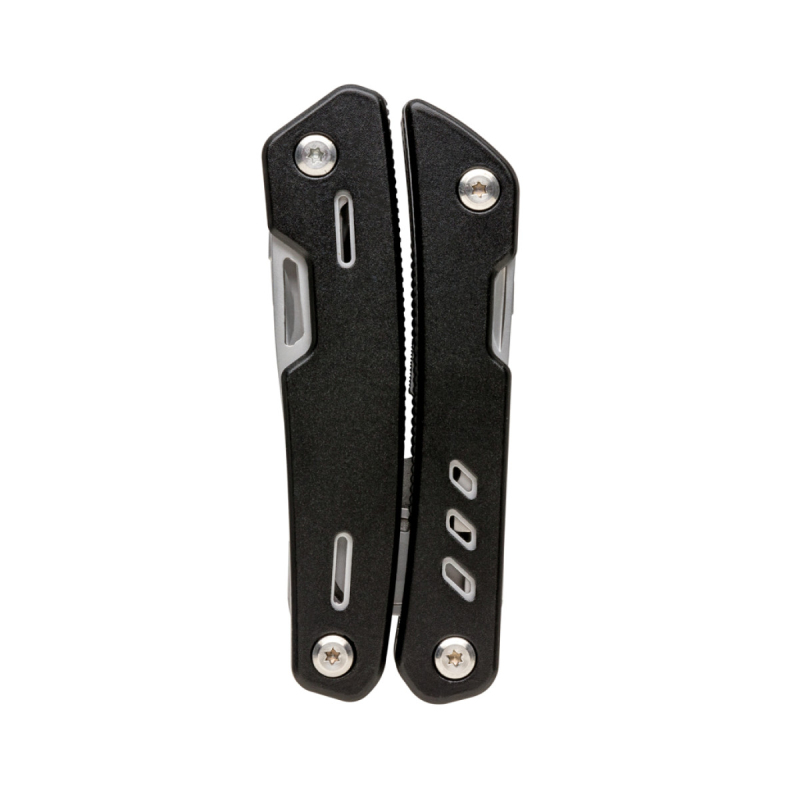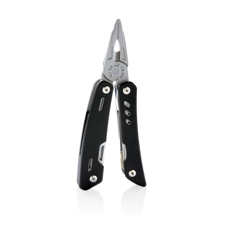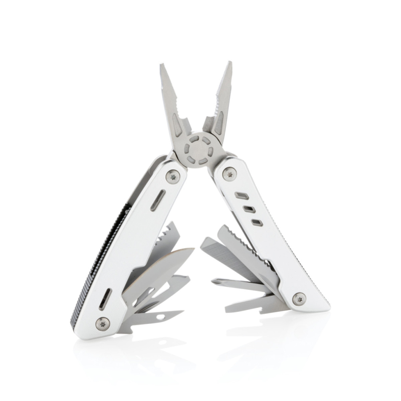 Kvalitní odolný multifunkční nůž s 12 funkcemi: kleště s jehlovou špičkou, utahovací kleště, štípací kleště, nůž s rovným ostřím, nůž se zubatým ostřím, křížový šroubovák, malý plochý šroubovák, pilka, otvírák plechovek a lahví, výstružník/šídlo, pilník/velký plochý šroubovák. Tělo z hliníku, nástroje z nerezové oceli. Baleno v dárkové krabičce.
