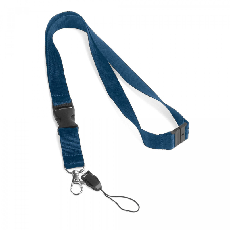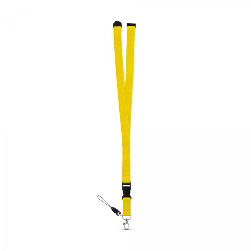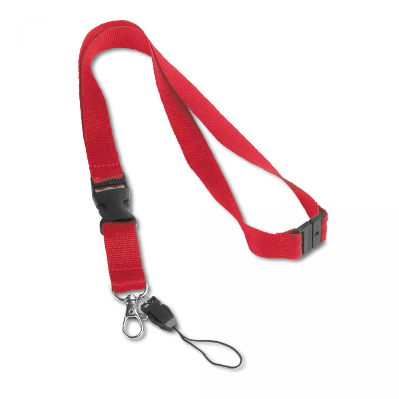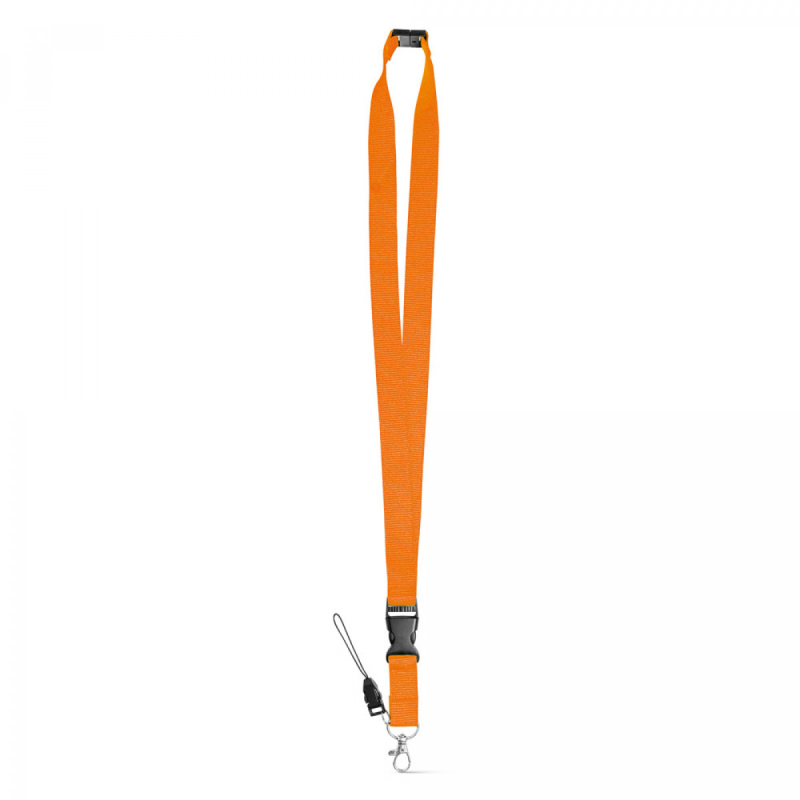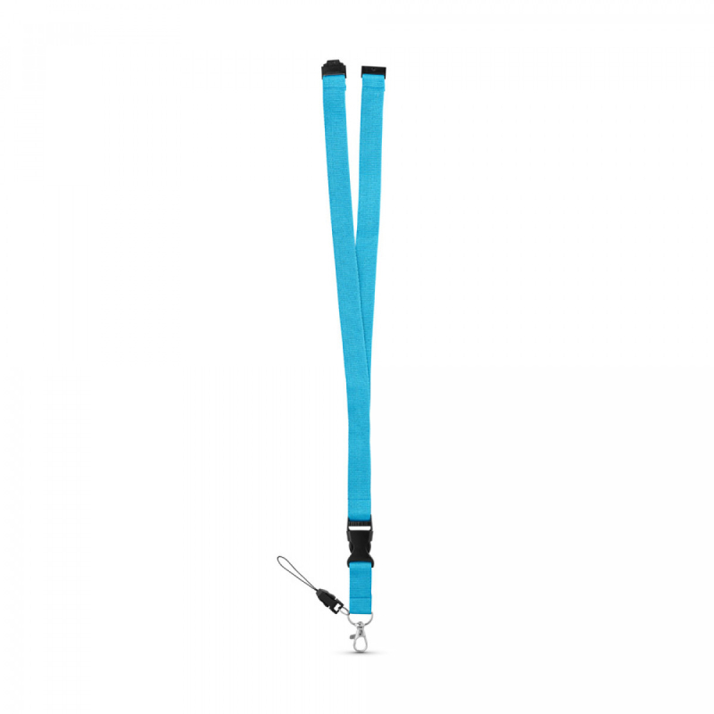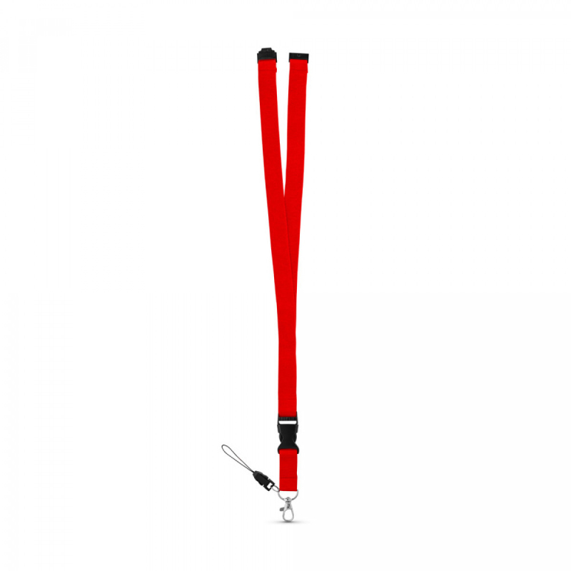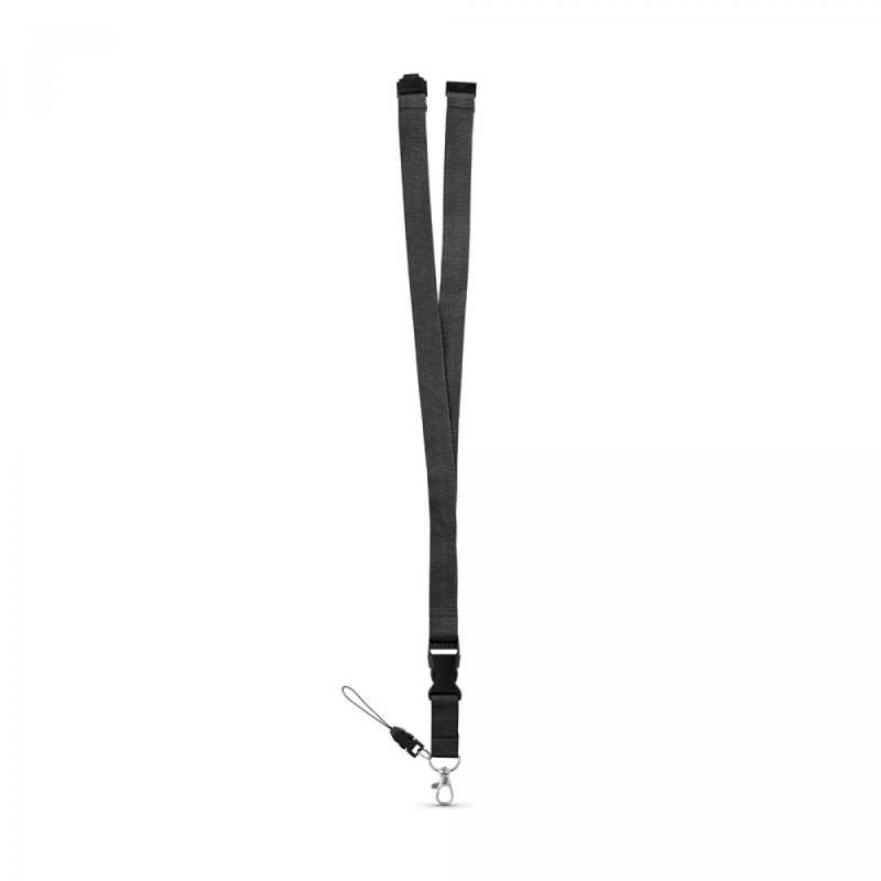 Polyesterová šňůrka s kovovou karabinou, odnímatelnou přezkou, popruhem na mobilní telefon a bezpečnostním zámkem. 20 x 510 mm