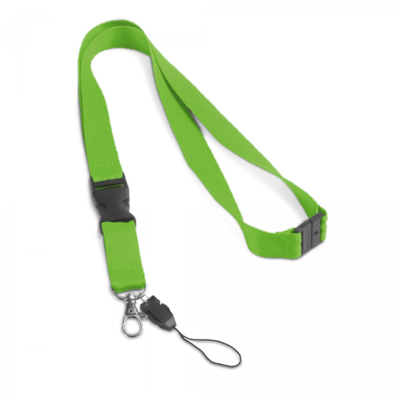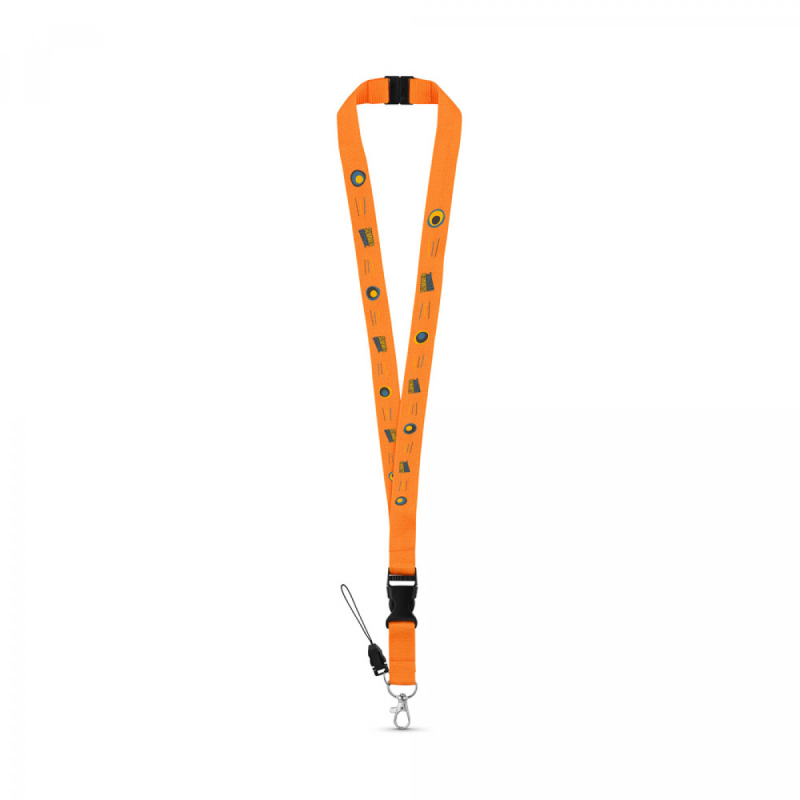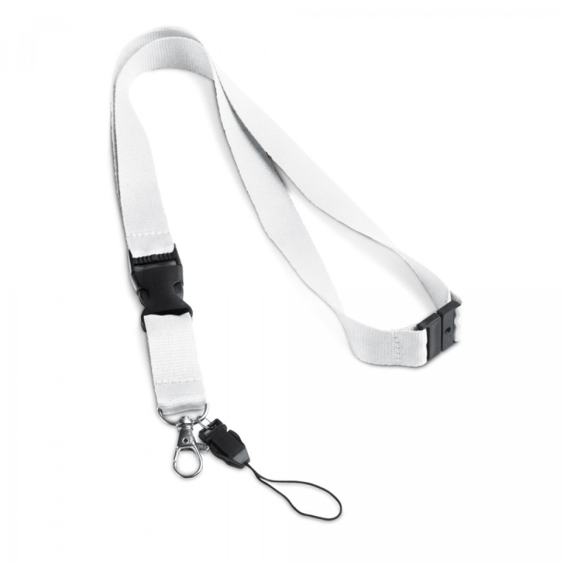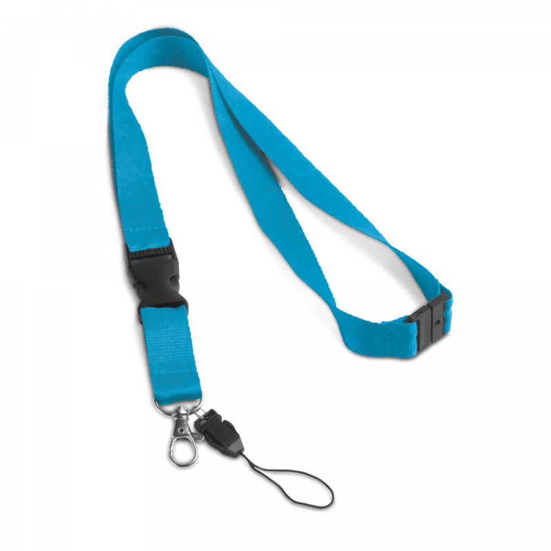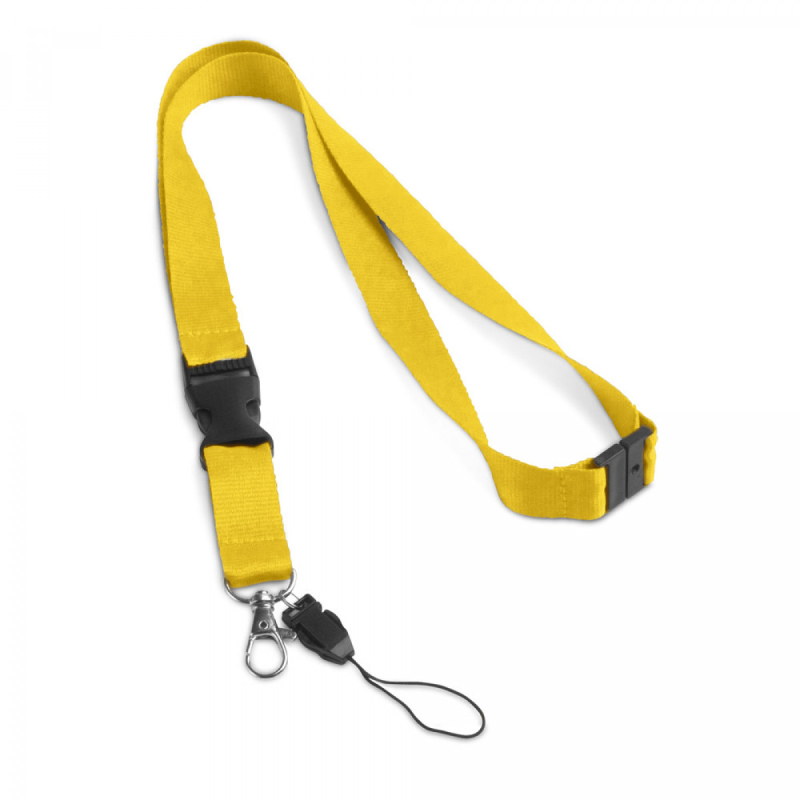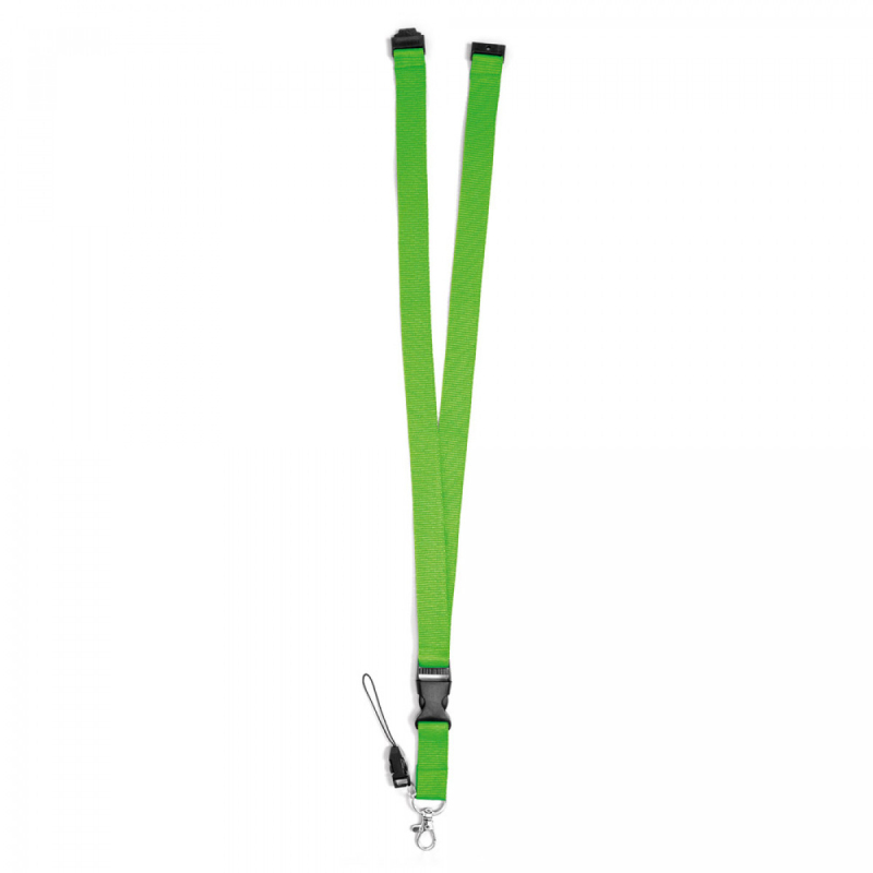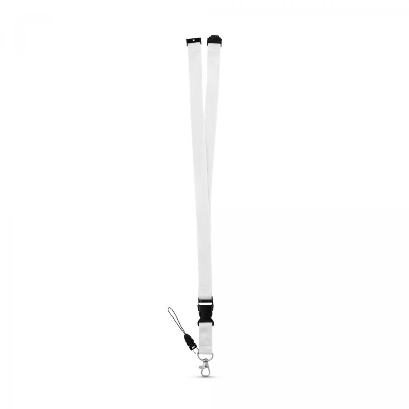 Polyesterová šňůrka s kovovou karabinou, odnímatelnou přezkou, popruhem na mobilní telefon a bezpečnostním zámkem. 20 x 510 mm