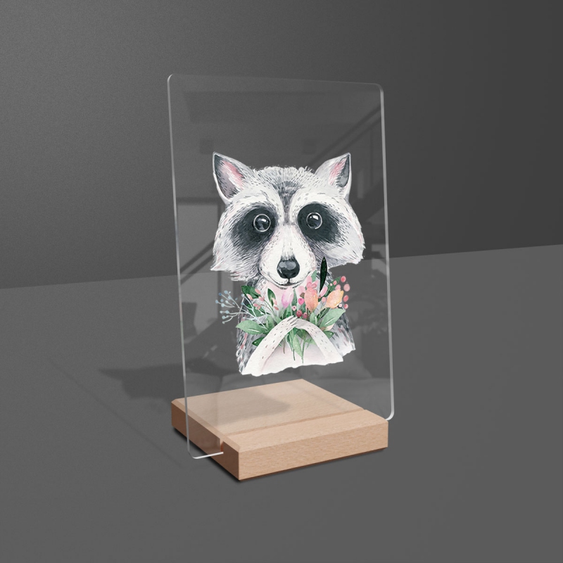 Na produktovém fotu vyobrazena nejoblíbenější varianta akrylového skla 14x21/21x14cm a dřevěný stojánek 10x10cm.