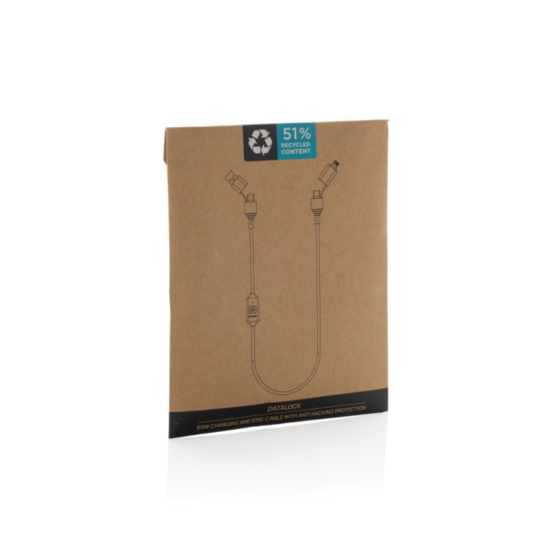 Nabíjecí a datový kabel, který nabije všechna mobilní zařízení nejvyšší rychlostí a podporuje i nabíjení notebooku. Kabel má unikátní integrované tlačítko pro vypnutí přenosu, aby se zabránilo krádeži dat nebo přístupu hackerů k vašemu telefonu. Jednoduše stiskněte tlačítko pro aktivaci ochranného režimu. Kabel je vyroben z recyklovaného TPE, PET, ABS a recyklovaného hliníku. Délka káblu 120 cm, podporuje Car play a Android auto. RCS certifikace zajišťuje garanci použití recyklovaného materiálu díky transparentnímu přehledu nad dodavatelským řetězcem. Celkový podíl recyklátu dle váhy produktu: 52 %. Baleno v papírovém obalu.