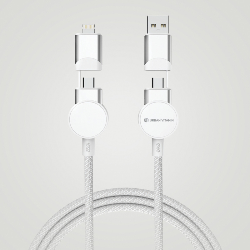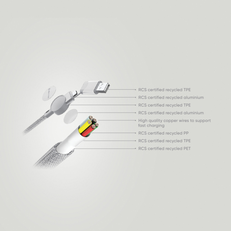 Nabíjecí kabel 6 v 1 umožňující nabíjení maximální rychlostí až do výkonu 45 W. Pouzdro vyrobené z recyklovaného TPE plastu s RCS certifikací, vnitřní část kabelu z recyklovaného TPE, vnější část z recyklovaného PET. RCS (Recycled Claim Standard) je globální standard, který umožňuje ověřit použití recyklovaného materiálu v produktu napříč celým dodavatelským řetězcem. Podíl použitého recyklovaného materiálu vzhledem k celkové váze produktu: 52 %. Kabel disponuje 5 konektory: USB C/USB A vstup, USB C/micro USB/iOS výstup. USB C je vhodné pro nabíjení moderních telefonů, ale i MacBooků. USB A má dvojí funkci (vstup i výstup) pro nabíjení jakéhokoliv zařízení z jakéhokoliv jiného zdroje. Výrobek je kompletně bez PVC. Max výkon USB C do Lightning: 18W, max výkon USB C do USB C: 45W. Délka: 120 cm. Podporuje nabíjení i přenos dat.