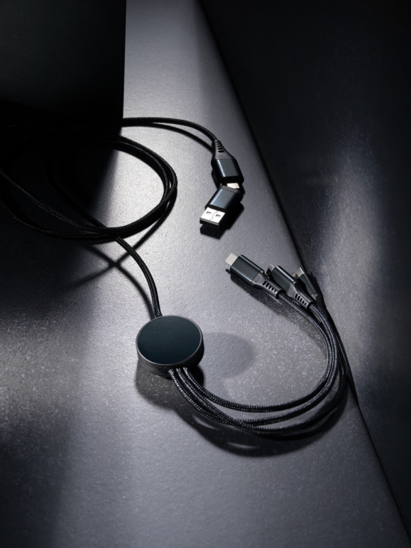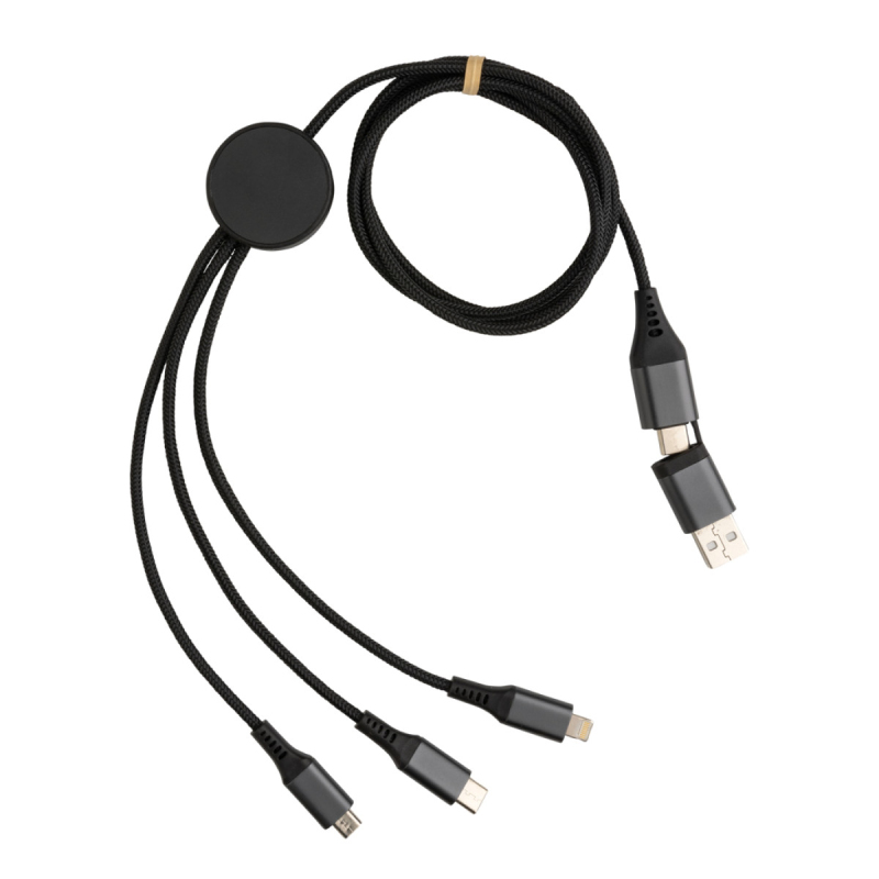 Nabíjecí kabel 6 v 1 vyrobený z RCS recyklovaného hliníku, recyklovaného TPE a recyklovaného PET. RCS (Recycled Claim Standard) je globální standard, který umožňuje ověřit použití recyklovaného materiálu v produktu napříč celým dodavatelským řetězcem. Podíl použitého recyklovaného materiálu vzhledem k celkové váze produktu: 65 %. Hliník při recyklaci neztrácí své vlastnosti, lze tak recyklovat opakovaně. Kabel disponuje 5 konektory: USB C/USB A vstup, USB C/micro USB/iOS výstup. USB C je vhodné pro nabíjení moderních telefonů, ale i MacBooků. USB A má dvojí funkci (vstup i výstup) pro nabíjení jakéhokoliv zařízení z jakéhokoliv jiného zdroje. PET opletené kabely délky 120 cm. Podporuje přenos dat (pouze USB C-USB C). Podporuje rychlonabíjení 9V/2A. Baleno v FSC® dárkovém balení.