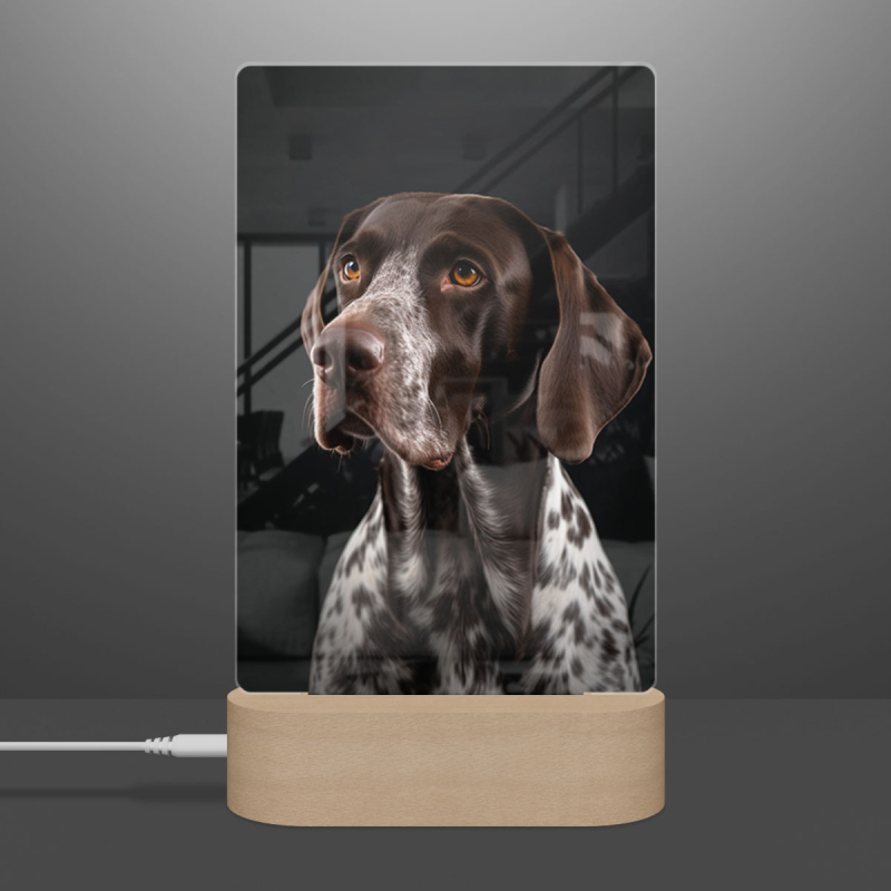 Součástí balení je akrylové sklo dle výběru, dřevěný RGB LED stojánek a napájecí USB kabel.