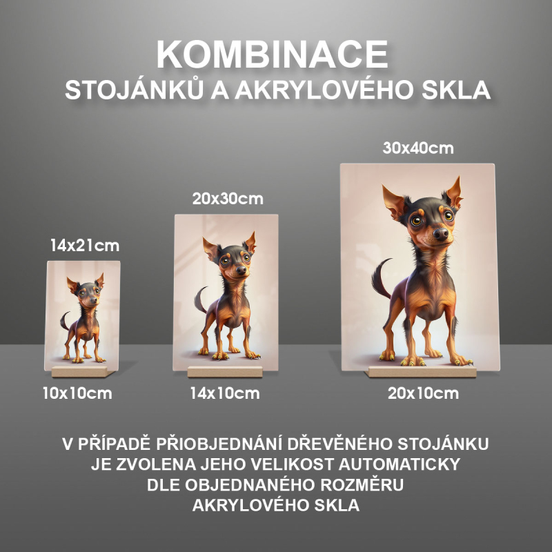 Na produktovém fotu vyobrazena nejoblíbenější varianta akrylového skla 14x21cm a dřevěný stojánek 10x10cm.