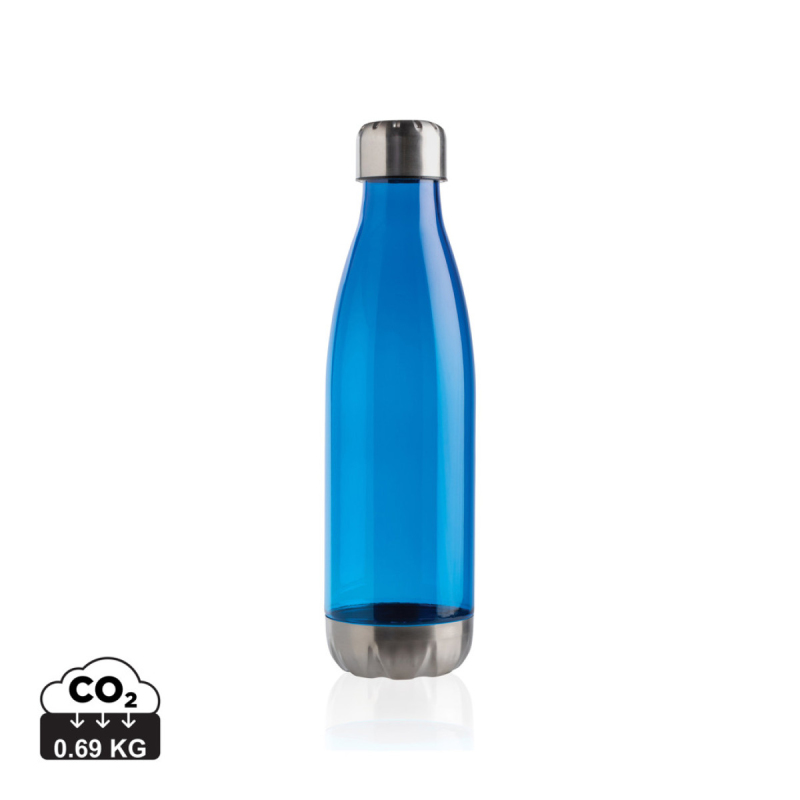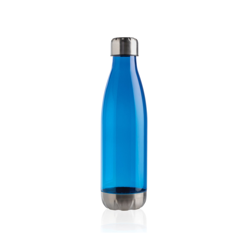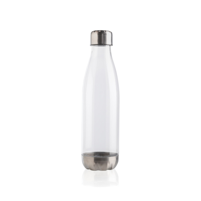 Nepropustná lahev na vodu s uzávěrem a podstavcem z nerezavějící oceli a průhledným tělem. Univerzální průměr pasující do většiny stojanů na hrnky a lahve. Objem: 500ml. Bez BPA.