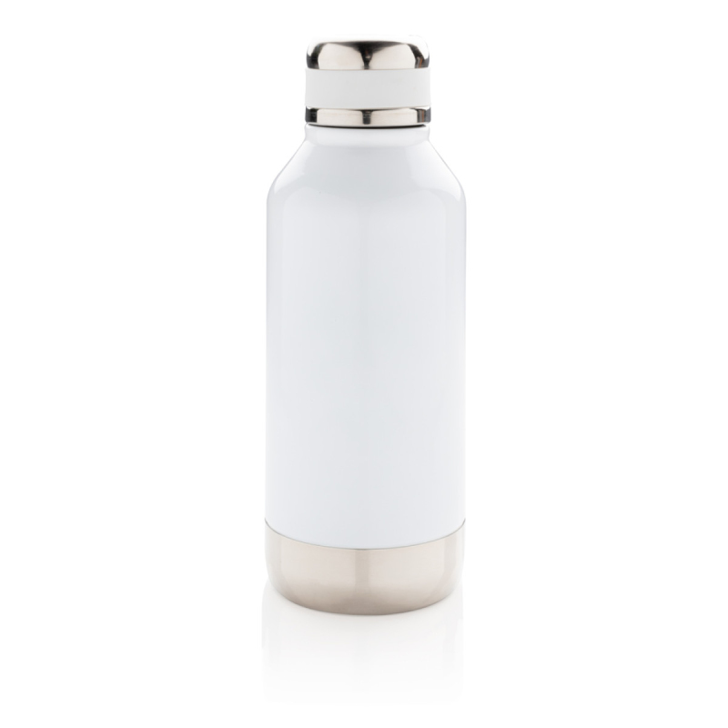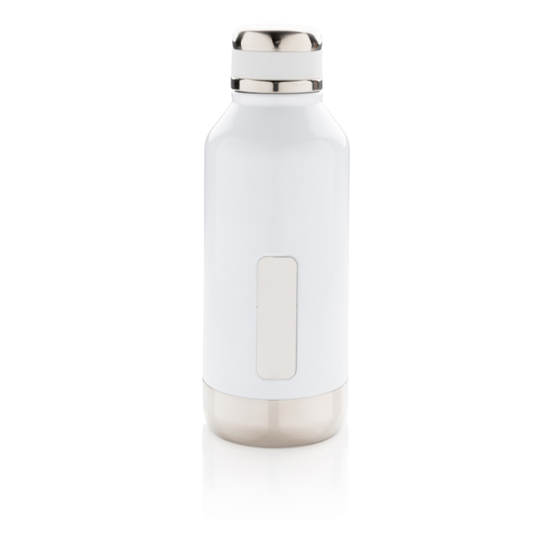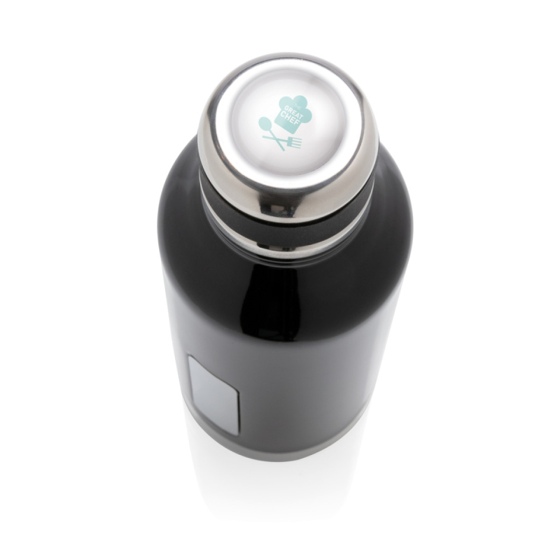Nepropustná termo láhev se šroubovacím uzávěrem. Unikátní možnost brandingu na vyhrazený plíšek na přední straně. Nerezavějící ocel 304 SS uvnitř a 201 SS vně. Nápoj udrží až 5h horký a až 15h studený. Objem: 500ml.