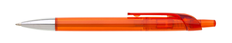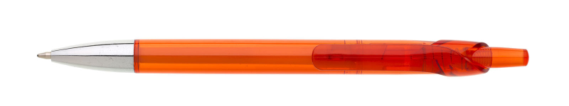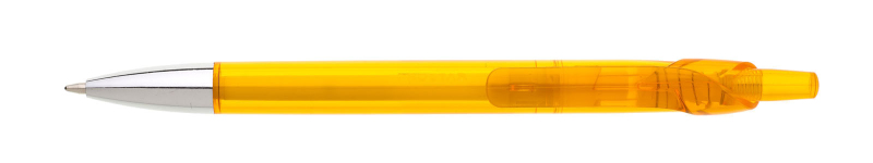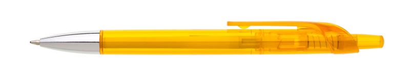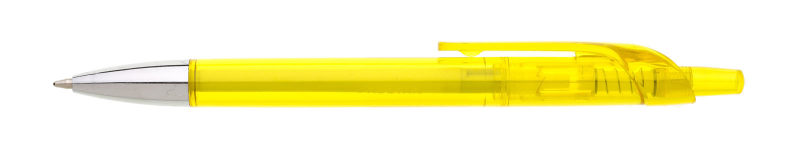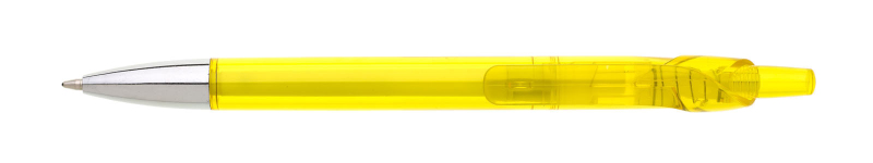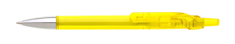 Plastová propiska NODO žlutá, její tělo i klip je z průhledného plastu, jen špička pera je z pochromovaná. Náplň velkoobsahová, modře píšící náplň.