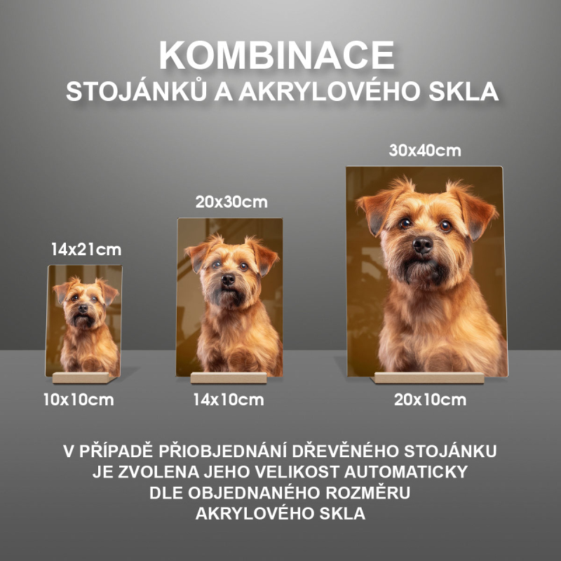 Na produktovém fotu vyobrazena nejoblíbenější varianta akrylového skla 14x21cm a dřevěný stojánek 10x10cm.