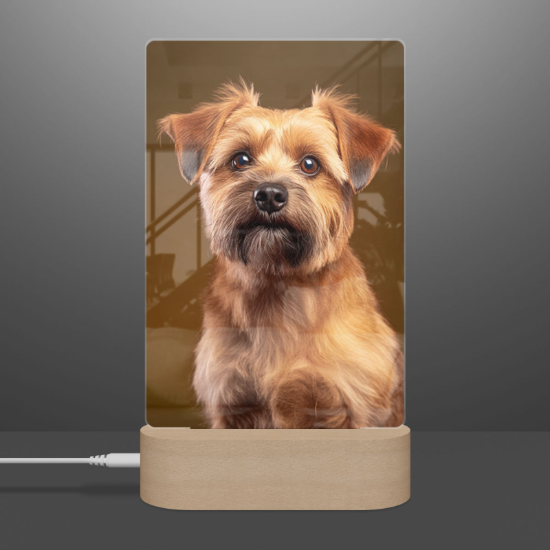 Součástí balení je akrylové sklo dle výběru, dřevěný RGB LED stojánek a napájecí USB kabel.