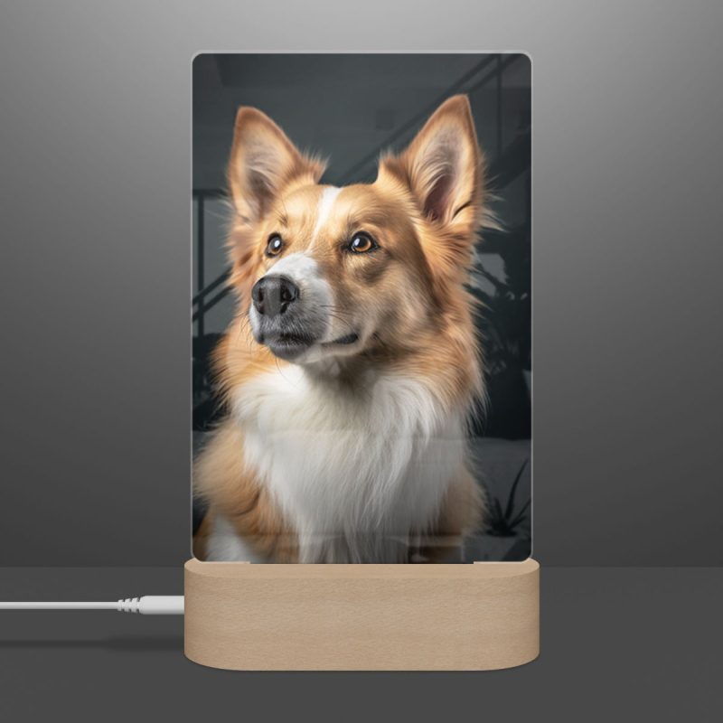 Součástí balení je akrylové sklo dle výběru, dřevěný RGB LED stojánek a napájecí USB kabel.