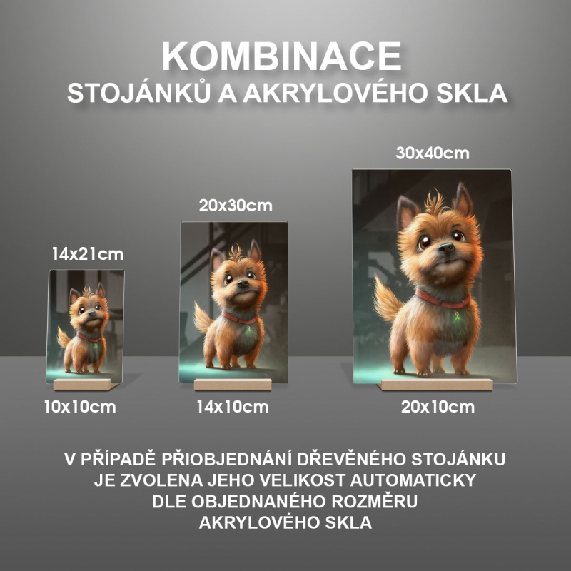 Na produktovém fotu vyobrazena nejoblíbenější varianta akrylového skla 14x21cm a dřevěný stojánek 10x10cm.