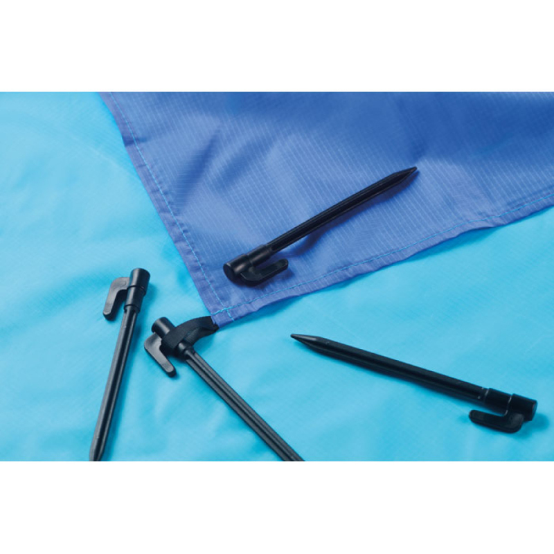 Lehká plážová deka z polyesteru 210T o rozměrech 200x210 cm. Čtyři skoby a stahovací pouzdro pro snadné přenášení.
