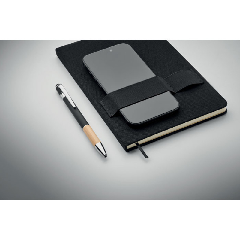 Zápisník A5 s tvrdými deskami z materiálu 600D RPET. Přední elastický pásek s funkcí držáku telefonu a pera. Včetně kuličkového pera s bambusovým úchopem a modrým inkoustem. Šitá vazba. 160 linkovaných stran z recyklovaného papíru (80 listů). Obálka na vnitřní zadní obálce. Elastický uzavírací pásek a záložka.