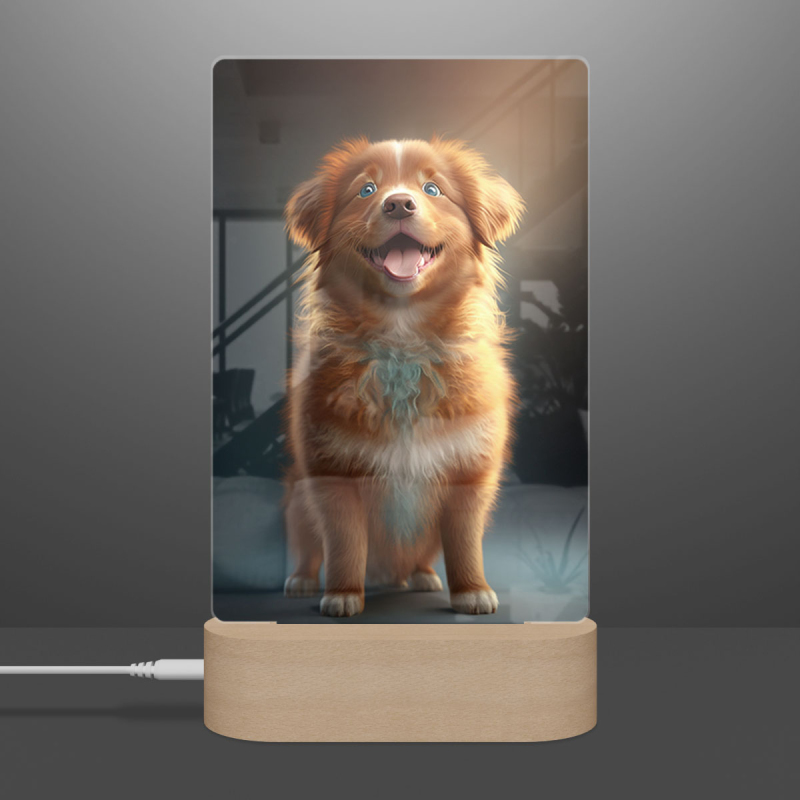 Součástí balení je akrylové sklo dle výběru, dřevěný RGB LED stojánek a napájecí USB kabel.