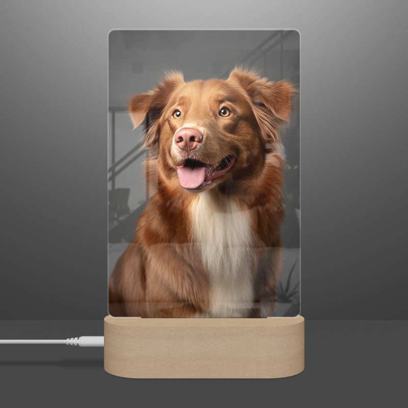 Součástí balení je akrylové sklo dle výběru, dřevěný RGB LED stojánek a napájecí USB kabel.
