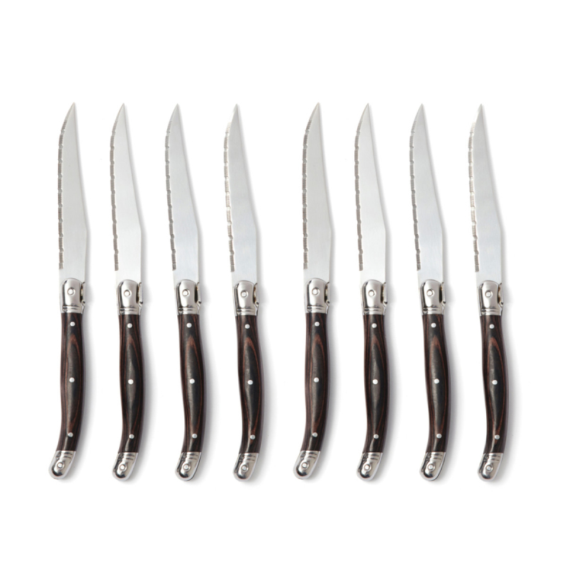 Vysoce kvalitní nože na maso v typickém bistro stylu inspirovaném Francií. Rukojeť z černého dřeva pakka a čepele z vysoce kvalitní nerezové oceli. Čepel má jemné zoubky, což umožňuje krájet potraviny s co nejmenším odporem. Sada čtyř nožů, které můžete snadno sladit s domácími vidličkami. Baleno v exkluzivní dárkové krabičce.