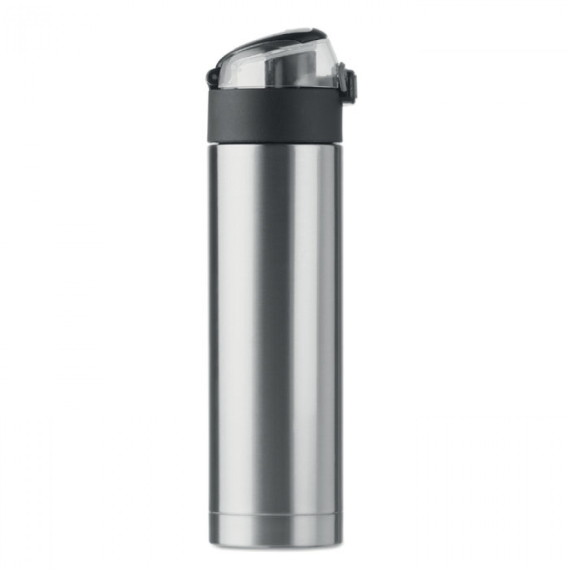 Nerezová 400ml láhev na pití s bezpečnostním uzávěrem a otvíráním ’’press-to-open’’. Skládací rukojeť pro lepší nošení. . Neteče.