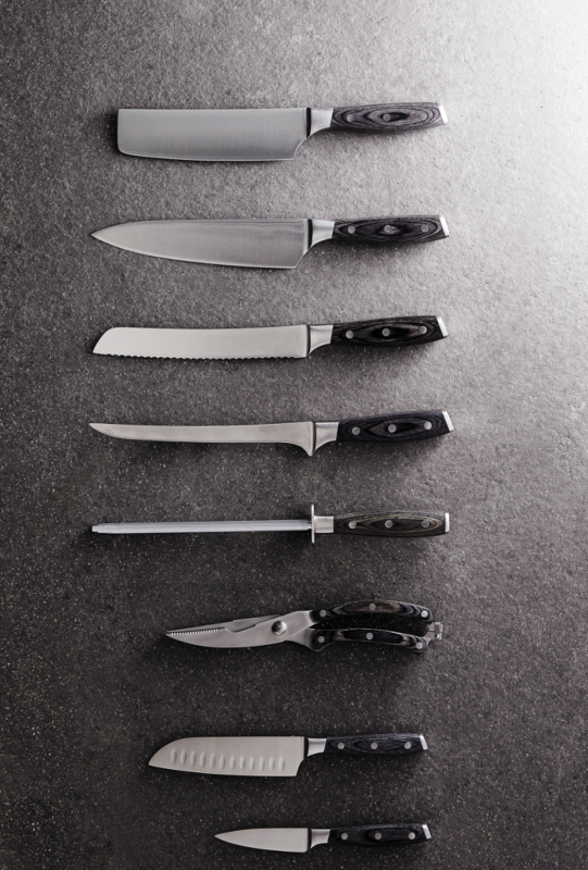 Nůž Santoku z německé oceli X50CrMoV15 s rukojetí ze dřeva pakka. Díky snadno uchopitelné rukojeti a vynikajícímu vyvážení čepele je práce s nožem pohodlná a snadná. Velikost: 14cm čepel.