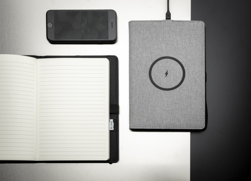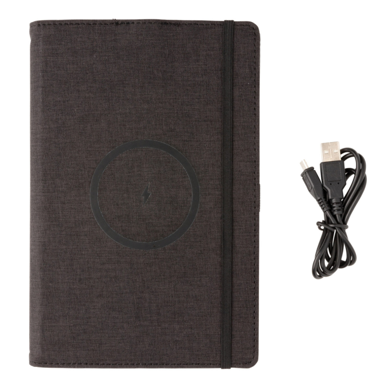 Opětovně doplnitelný obal na zápisník vyrobený z polyesteru s integrovanou bezdrátovou nabíječkou v předním obalu. Jednoduše nabíječku připojte ke zdroji napájení (např. externí powerbance) a položte telefon pro bezdrátové nabíjení. 80cm dlouhý micro USB kabel je součástí balení. Obal vyrobený z polyesteru s elastickou gumičkou, vnitřní část z černého soft PU. A5 zápisník s 80 listy/160 stranami linkovaného krémového papíru o gramáži 70g/m2. Ochranný vzor®