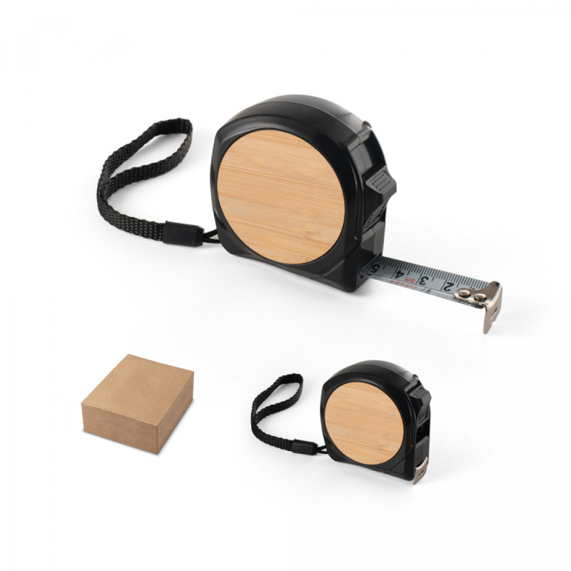 Páska o dé,lce 5 metrů vyrobená ze 100% recyklované,ho ABS a bambusu. Obsahuje brzdu, kovový klip a poutko k připevnění na zápěstí. Dodáváno v dárkové, krabičce z kraftové,ho papíru. 35 x 33 x 19 mm