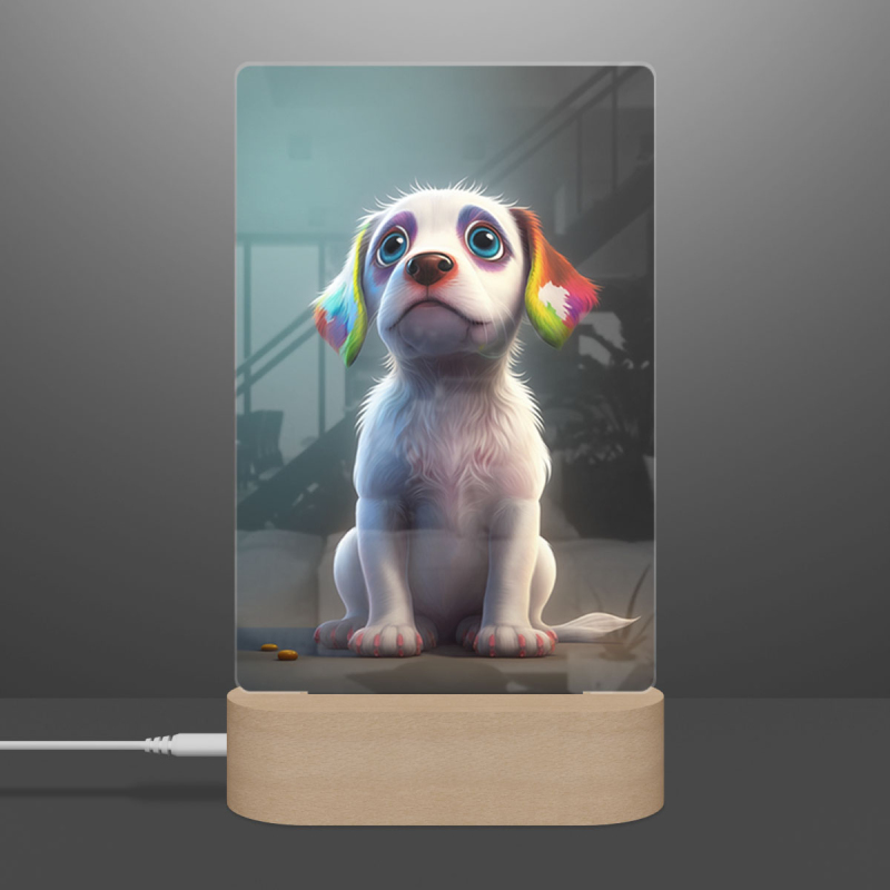 Součástí balení je akrylové sklo dle výběru, dřevěný RGB LED stojánek a napájecí USB kabel.