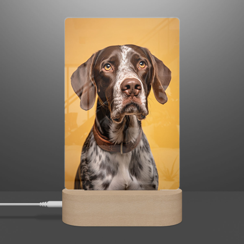 Součástí balení je akrylové sklo dle výběru, dřevěný RGB LED stojánek a napájecí USB kabel.