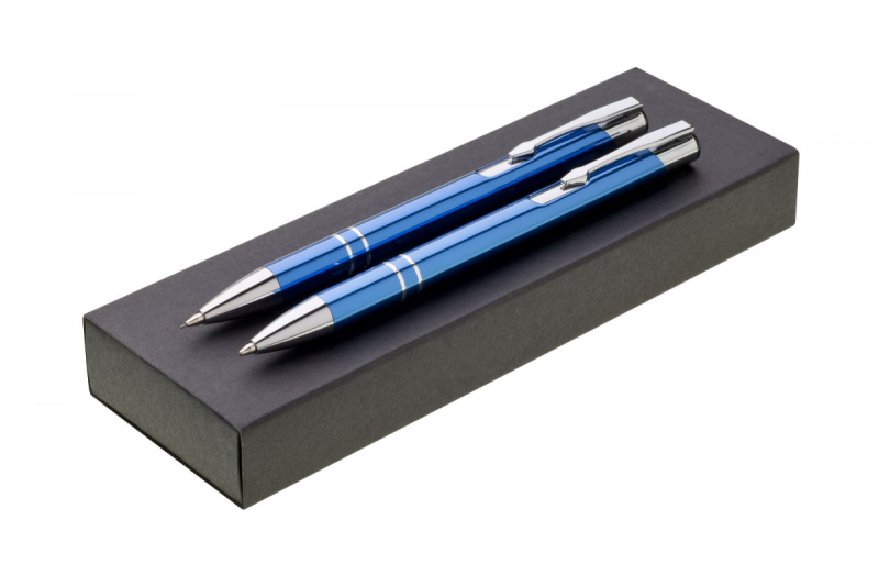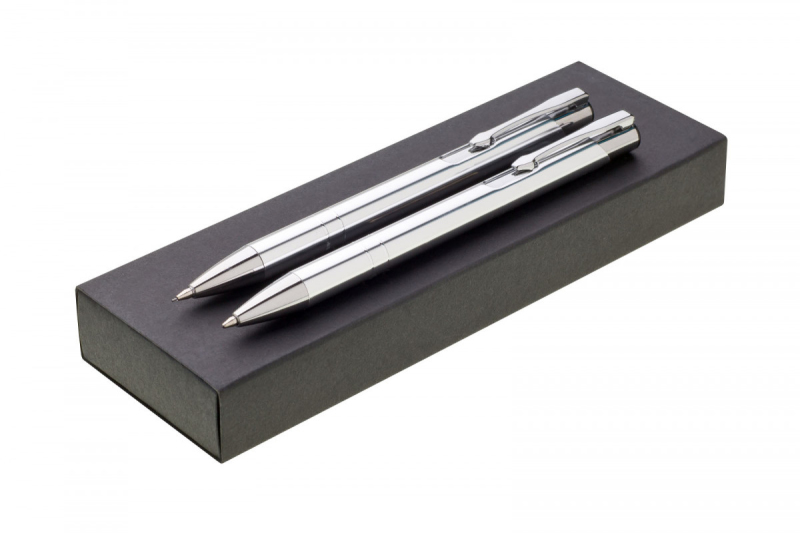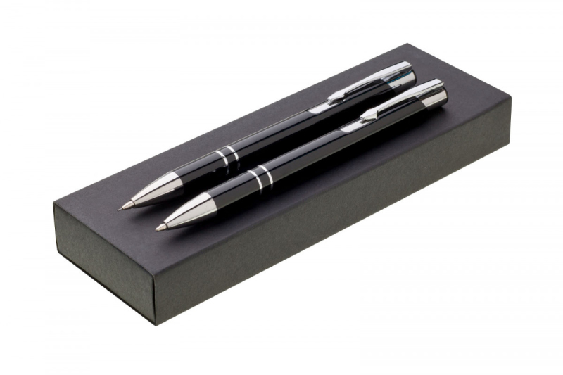 Sada ORIN červená, tužky jsou vyrobeny z hliníku, na těle mají 2 stříbrné proužky a doplňky. Dodávají se v černé papírové krabičce.