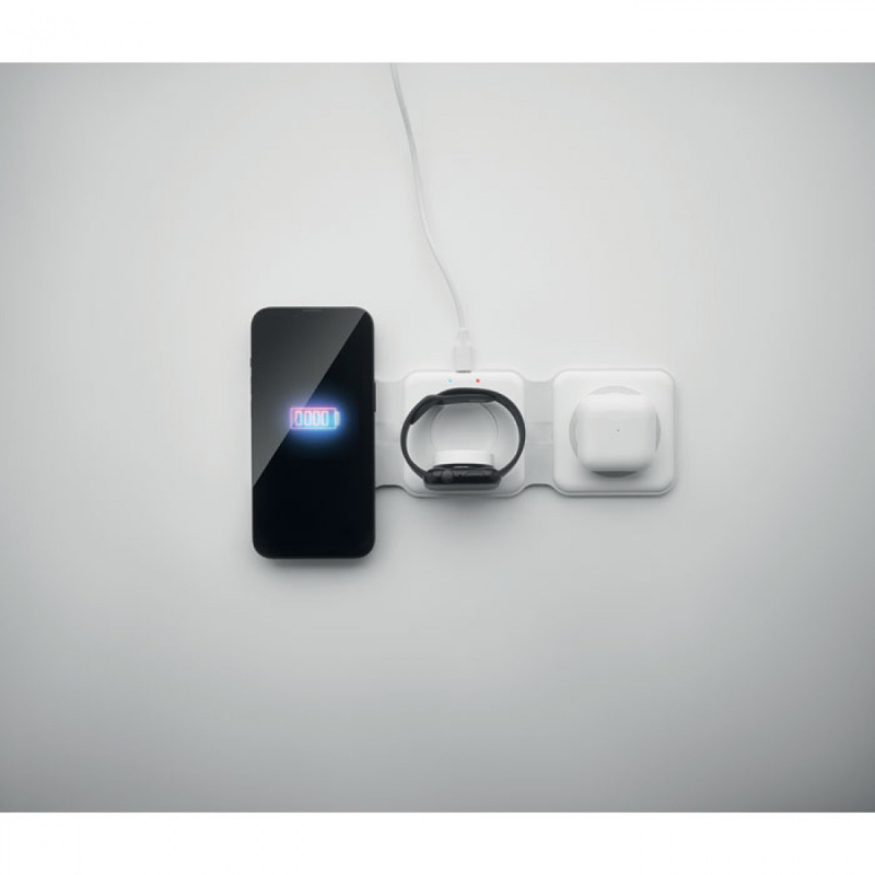 Skládací nabíjecí stanice 3v1 z ABS. 3 nabíjecí plochy. Vstup: 2v1 typ C a typ A. Kompatibilní se všemi zařízeními s podporou QI, jako jsou nejnovější Androidy, iPhone® 8, X a novější. Kompatibilní také s hodinkami iWatch.