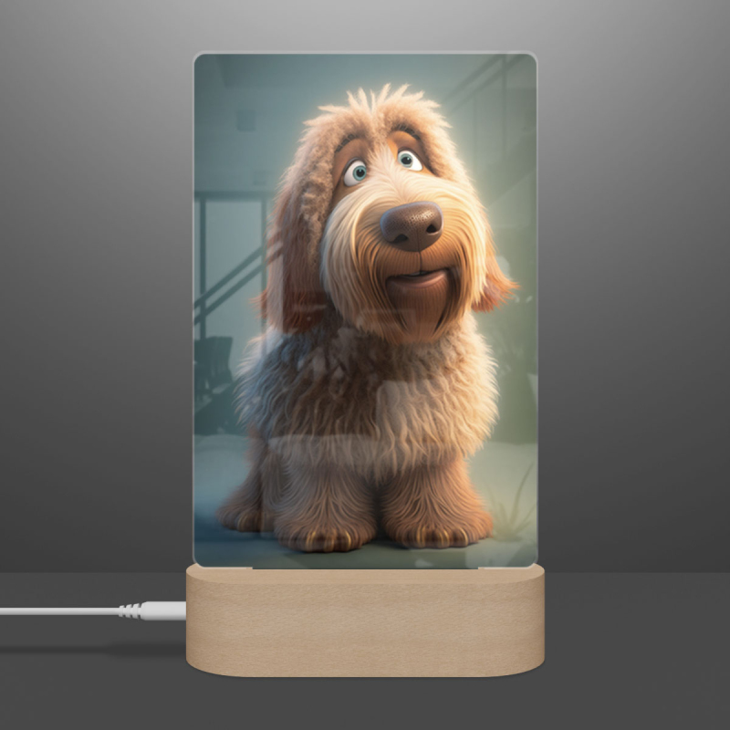 Součástí balení je akrylové sklo dle výběru, dřevěný RGB LED stojánek a napájecí USB kabel.