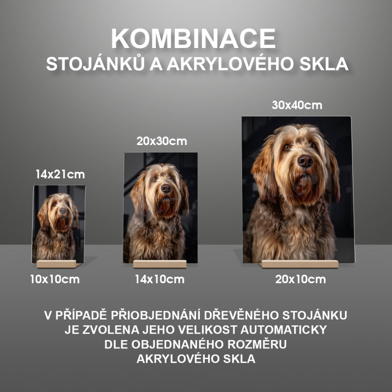 V případě přiobjednání dřevěného stojánku je zvolena jeho velikost automaticky dle objednaného rozměru akrylového skla viz produktové foto.