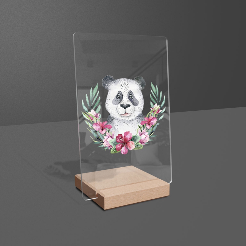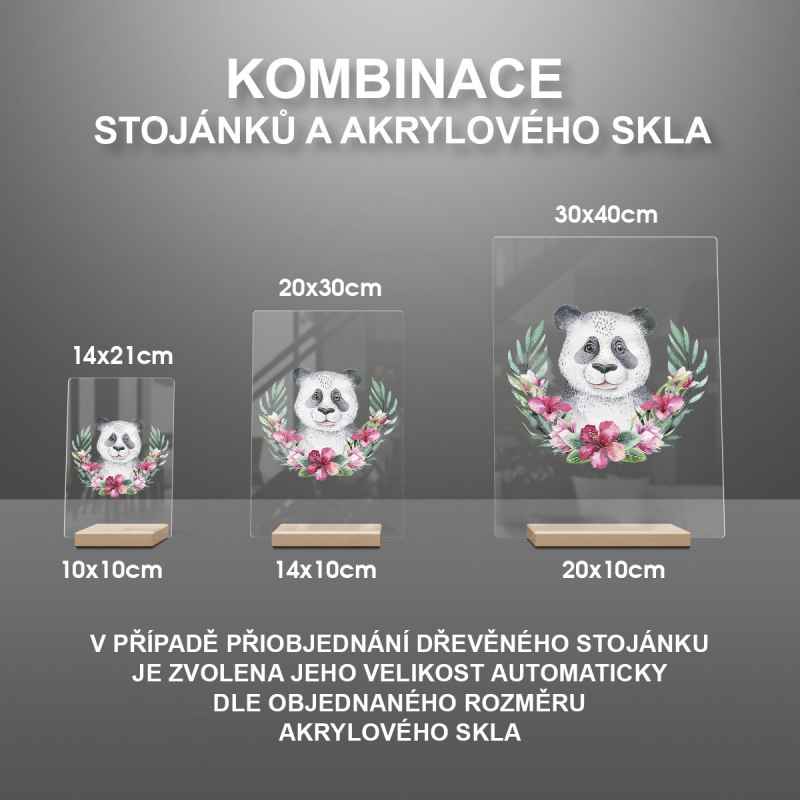 Na produktovém fotu vyobrazena nejoblíbenější varianta akrylového skla 14x21/21x14cm a dřevěný stojánek 10x10cm.