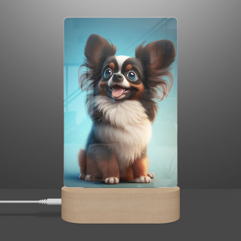 Součástí balení je akrylové sklo dle výběru, dřevěný RGB LED stojánek a napájecí USB kabel.