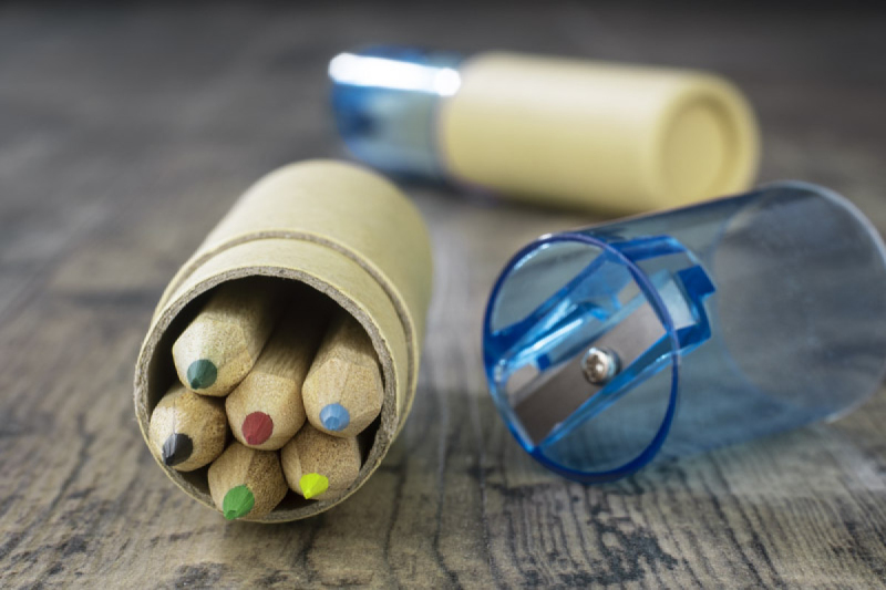 Dřevěné 6-barevné tužky. Balené do papírové trubky s plastovým uzávěrem. V tomto uzávěru je umístěn ořezávač. Logo může být vyraženo na trubce.