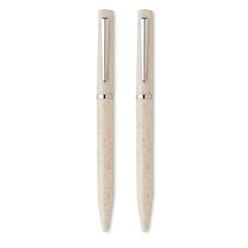 Psací sada obsahující kuličkovou propisku s modrým inkoustem a nekonečnou bezinkoustovou tužku. Vyrobeno z pšeničné slámy/ABS. Dodáváno v krabičce z recyklovaného papíru.