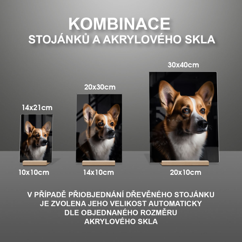 V případě přiobjednání dřevěného stojánku je zvolena jeho velikost automaticky dle objednaného rozměru akrylového skla viz produktové foto.