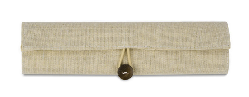 Ekologická pouzdro na tužky vyrobené z bavlněného lnu. Uzavřeno knoflíkem. Soubor obsahuje 3 ekologické kuličkové pera (černé, modré, červené), tužku, tužkovač, gumu, pravítko. Logo bude tisknuto.