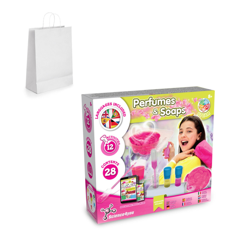 Vzdělávací hra Parfémy a mýdla, ideální pro děti, aby objevily, jak si vyrobit vlastní mýdla a parfémy. Doporučený věk: 8+ let. Dodáváno s dárkovou taškou z kraftového papíru (90 g/m²). 234 x 220 x 65 mm