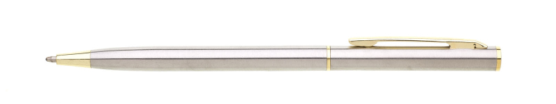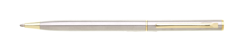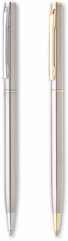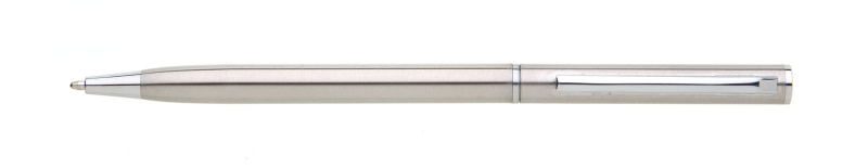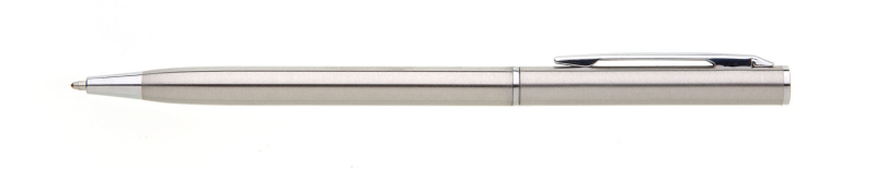 Tenká propiska s otočným mechanismem o rozměrech 130x 7,5 mm. Materiál - nerezová ocel, náplň modře píšící.