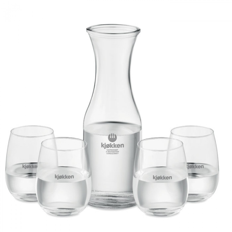 Sada na nápoje z recyklovaného skla. Karafa (1 l) s korkovým víčkem a 4 sklenice (420 ml).