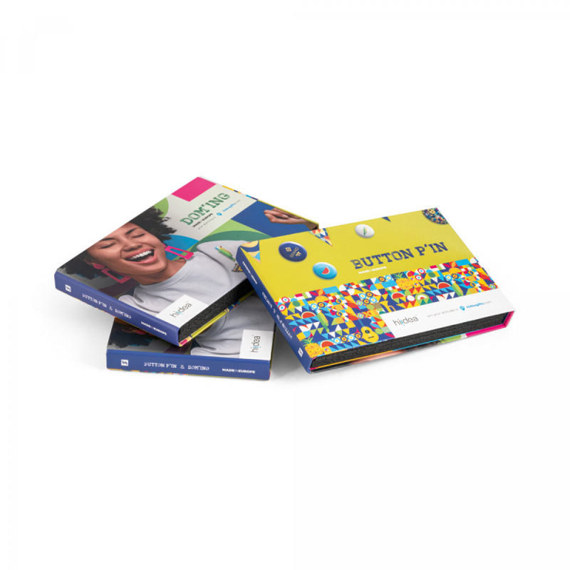 Vzorkovník 2 v 1 na odznáčky a doming v plastickém obalu z kartonu s magnetickým zavíráním. Vnitřní část je rozdělena na dvě části, které obsahují různé modely odznáčků (kulaté a čtvercové) a personalizované odznaky a klíčenky ve veselých barvách a tvarech. Vzorkovník je odlehčený a vnitřek z pěny obsahuje vhodné doplňky k ukládání různých personalizovaných vzorků. 305 x 230 x 25 mm