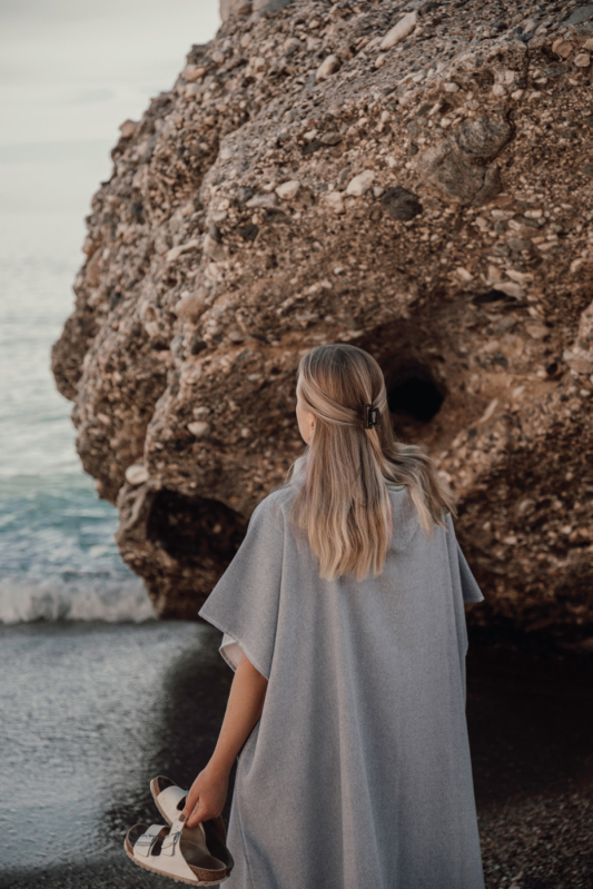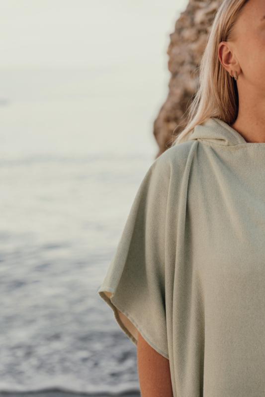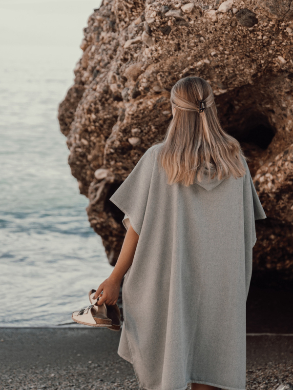 Hamam poncho navržené s dvěma typy textury. Na jedné straně froté, na druhé straně plátnová vazba. Poncho je praktický a univerzální oděv vhodný na pláž nebo kamkoliv k vodě. Vyniká vysokou savostí a rychlým schnutím. Vyrobeno ze 75 % bavlny a 25 % polyesteru. Gramáž: 360 g/m2. Rozměr: 100 x 95 cm. OEKO-TEX® STANDARD 100. 09.HIN.68091. Hohenstein HTTI.