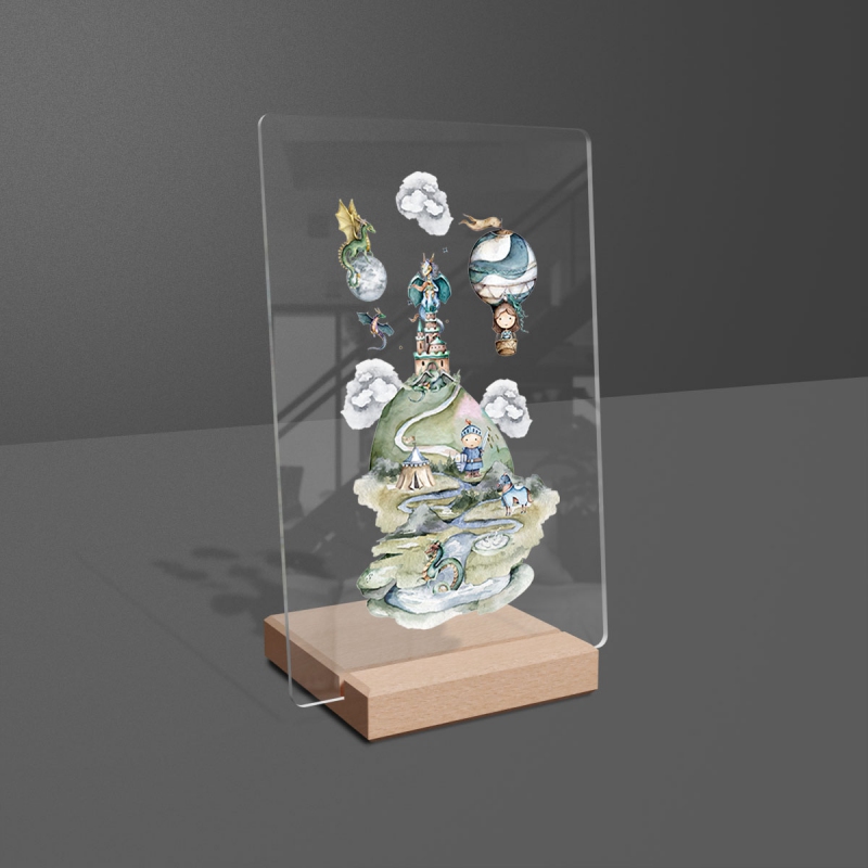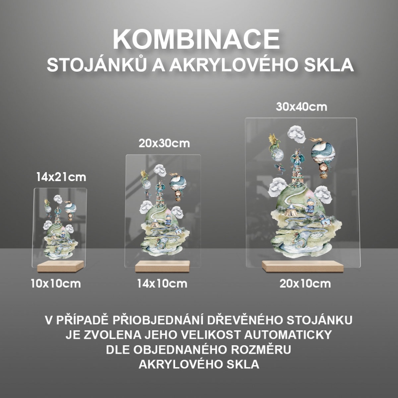 Na produktovém fotu vyobrazena nejoblíbenější varianta akrylového skla 14x21/21x14cm a dřevěný stojánek 10x10cm.