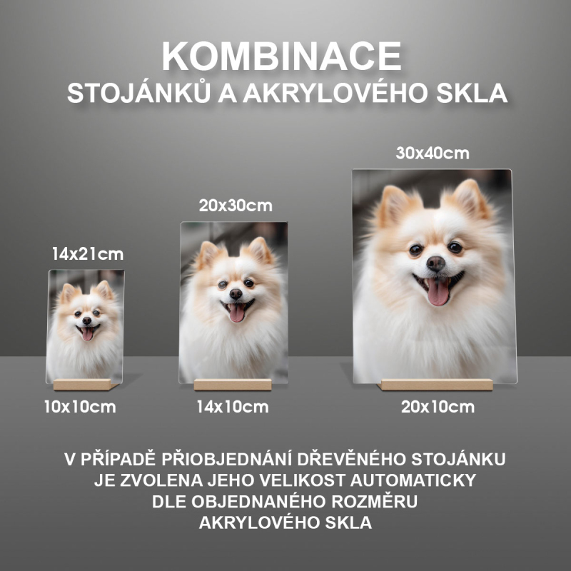 Na produktovém fotu vyobrazena nejoblíbenější varianta akrylového skla 14x21cm a dřevěný stojánek 10x10cm.