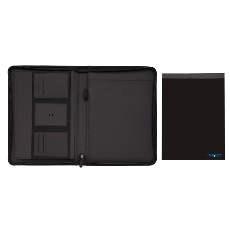 Skutečně transparentní ekologie. Kolekce Impact obsahuje vystopovatelnou složku AWARE™, která využívá moderní možnosti skenování a technologie blockchain, díky čemuž lze s jistotou garantovat recyklovaný původ použitého materiálu a reálnou úsporu vody. Na výrobu tohoto produktu bylo využito 10 PET lahví a bylo uspořeno 6 litrů vody. Z výtěžku každého prodaného produktu z kolekce Impact je přispěno 2 % na podporu iniciativy Water.org. Unikátní portfolio se zipem ve formátu A4 vyrobené z RPET AWARE™. Uvnitř obsahuje 1 velkou kapsu, kapsu na telefon, 2 dodatečné menší kapsy, 4 sloty na karty a poutko na pero. Včetně poznámkového bloku s 20 listy/40 stranami recyklovaného krémového linkového papíru o gramáži 80g/m2. Vnější tkanina a vnitřní podšívka je vyrobena ze 100 % polyesteru AWARE™ získaného z recyklovaných PET lahví. Bez PVC. Kalkulace úspor vychází z ověřených LCA dat zveřejněnými globální neziskovou organizací Textile Exchange.