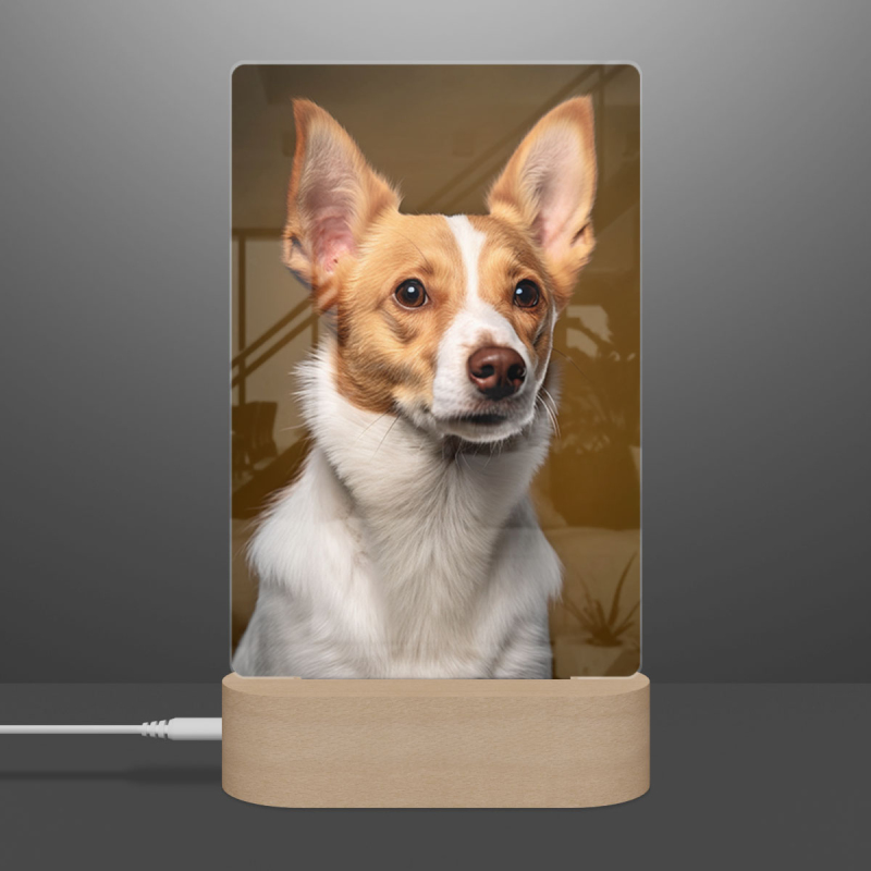 Součástí balení je akrylové sklo dle výběru, dřevěný RGB LED stojánek a napájecí USB kabel.