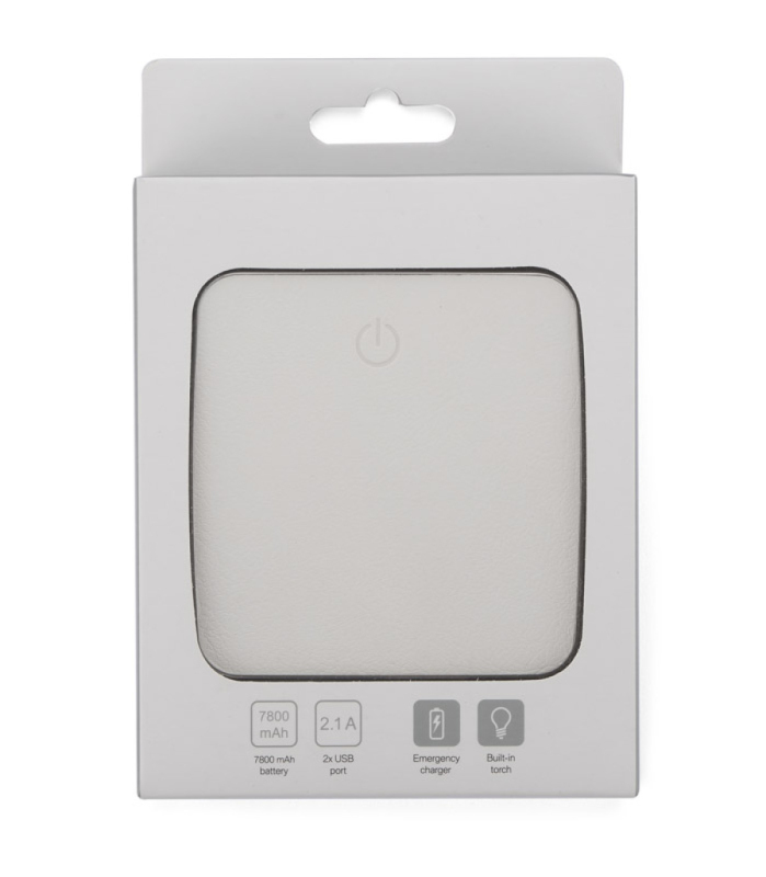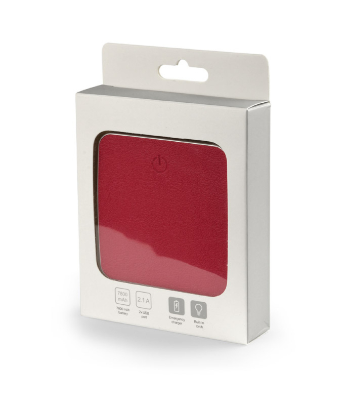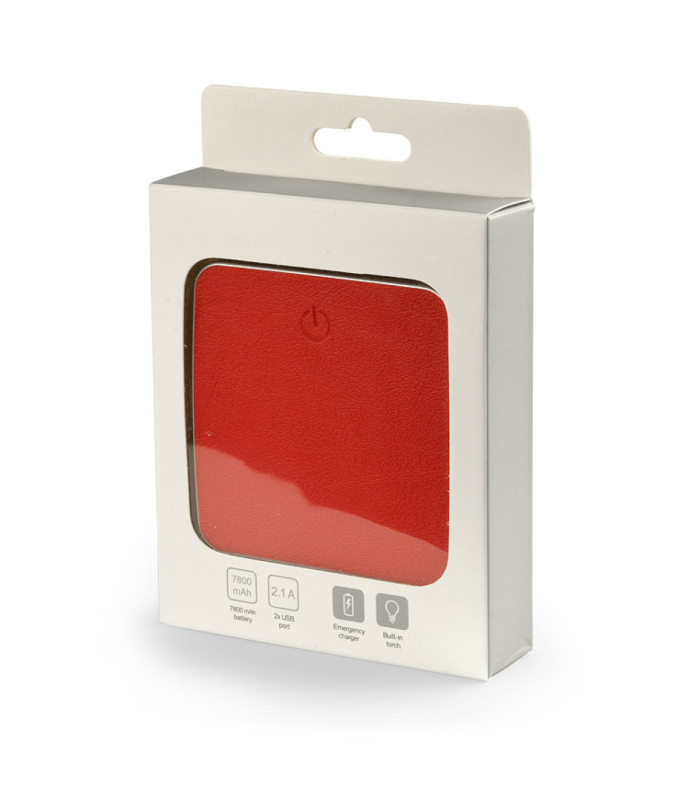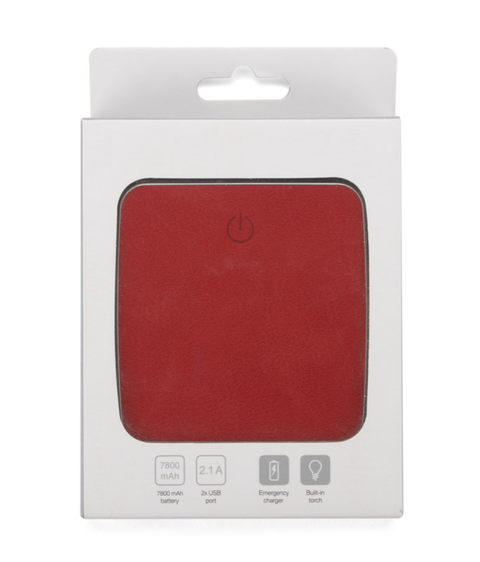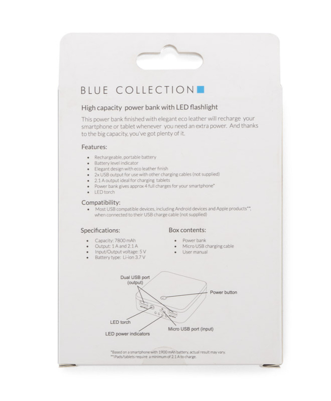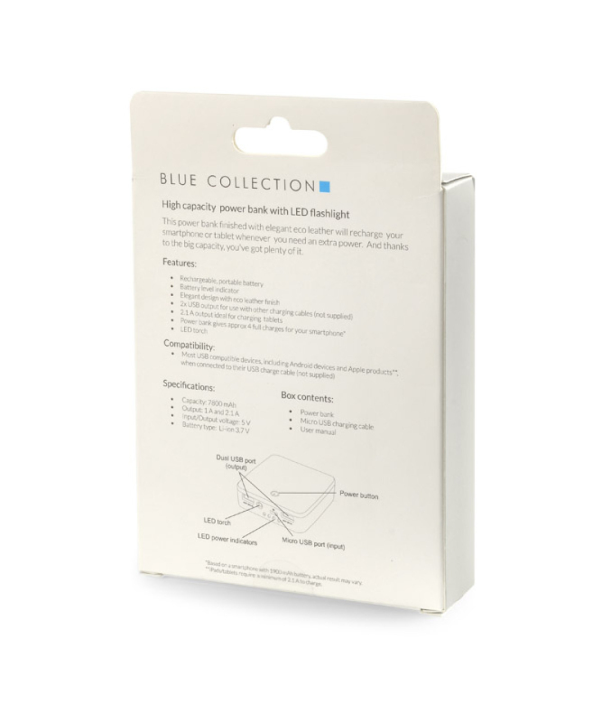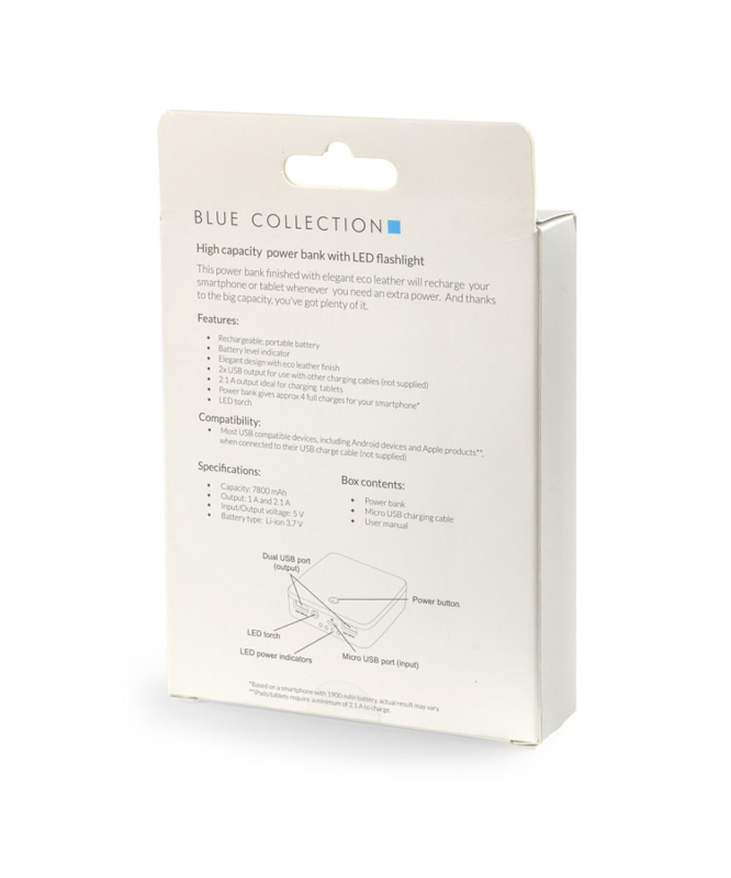 Praktická power banka s kapacitou 7800 mAh. 2 USB porty umožňují současné dobíjení dvou zařízení. Vyrobeno z plastu a ekokoženky je velmi lehké ve srovnání s jinými podobnými power bankami. Vstup 5V / 1A, výstup 5V / 1A a 2,1 A. Power banka je vybavena baterkou a 4 LED diodami ukazujícími úroveň nabití baterie. Přiložený mikro USB kabel. POZNÁMKA - tmavší odstín než standardní. V tomto ohledu nebudeme přijímat reklamace.