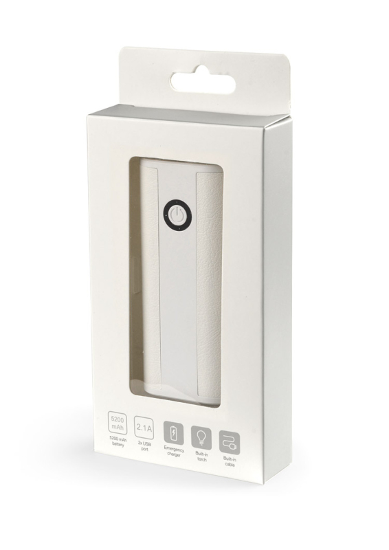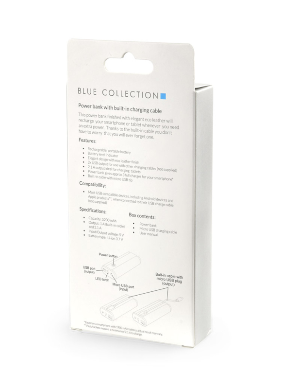 REMOTE je power bank s kapacitou 5200 mAh. Strany přístroje jsou pokryty ekologickou kůží. Power bank má vestavěný mikro USB kabel, baterku se dvěma režimy (trvalý a blikající) a 4 LED diodami ukazujícími úroveň nabití baterie. Vstup 5 V / 1 A, výstup 5 V / 1 A (integrovaný kabel) a 2,1 A (USB port). Mikro USB kabel je připojen.