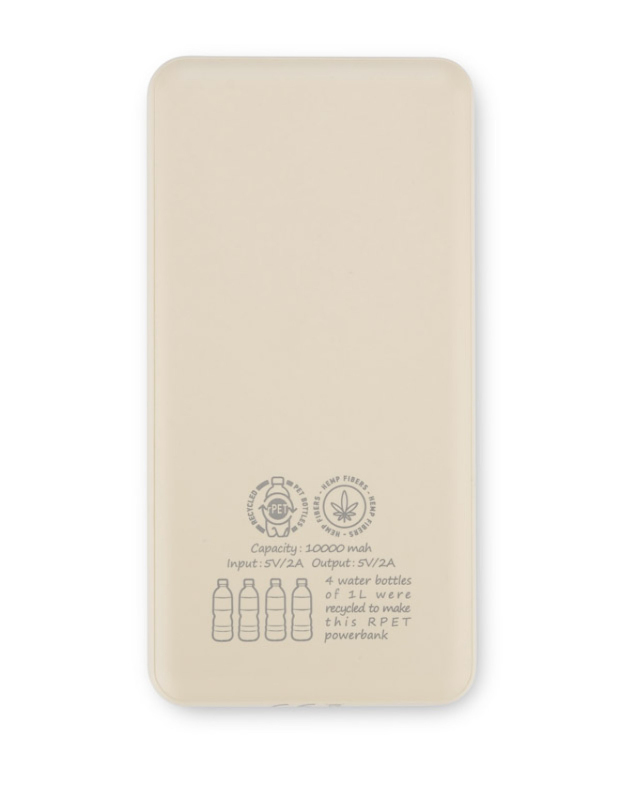 Powerbanka rPET REPPO s kapacitou 10 000 mAh je vyrobena z materiálu z recyklovaných čtyř 1litrových lahví a konopných vláken. Produkt lze nabíjet přes 4 porty: 2 x USB-A, 1 x USB-C, 1 x microUSB. Technické údaje: - vstup: 5V/2A, - výstup: 5V/2A. Čtyřstupňový indikátor nabití. Výrobek splňuje příslušné směrnice Evropské unie, označení CE a 1letou záruku. Sada obsahuje nabíjecí kabel s microUSB konektorem. Baleno v recyklované kartonové krabici s potiskem pomocí inkoustu na sójové bázi.