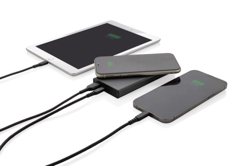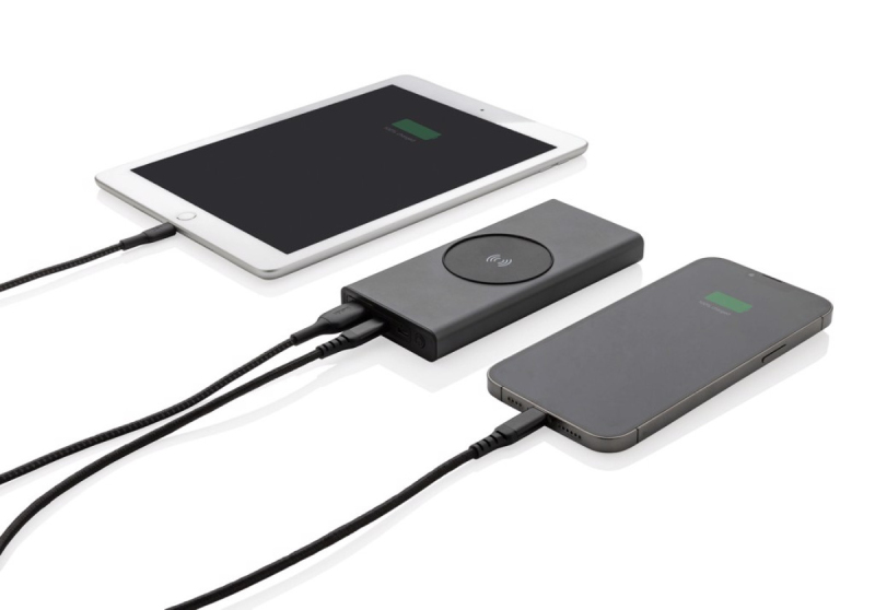 Ultra rychlá powerbanka s kapacitou 10 000 mAh a celkovým výkonem až 18 W. Vyrobená z recyklovaného hliníku a ABS plastu s RCS certifikací. RCS (Recycled Claim Standard) je globální standard, který umožňuje ověřit použití recyklovaného materiálu v produktu napříč celým dodavatelským řetězcem. Celkový podíl recyklátu dle váhy produktu: 28 %. Hliník při recyklaci nijak neztrácí své vlastnosti, lze jej tedy opakovaně recyklovat. Kvalitní lithium polymerová baterie řady A s kapacitou 10 000 mAh. USB C umožňuje nabíjení výkonem až 18 W a rychlé dobití powerbanky už za 3 hodiny. Dva dodatečné USB A výstupy. Bezdrátové nabíjení s výkonem 10 W. Světelné indikátory stupně nabití. Micro USB vstup: 5V/2A, 9V/2A, 12V/1.5A, USB C vstup: 5V/2A, 9V/2A, 12V/1.5A. USB výstup: 5/3A, 9V/2A. 12V/1.5A, USB C výstup: 5V/3A, 9V/2A, 12V/1.5A. Včetně USB C nabíjecího kabelu z RCS recyklovaného hliníku, TPE a PET. Baleno v FSC® dárkové krabičce. Výrobek je kompletně bez PVC.